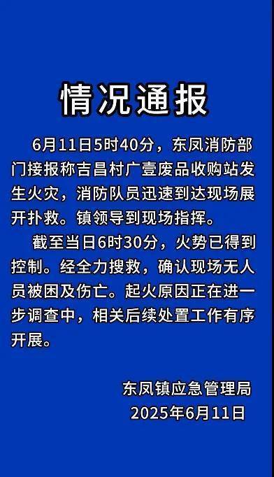 通报称,11日5时40分,东凤消防部门接报称吉昌村广壹废品收购站发生火灾,消防队员迅速到达现场展开扑救。截至当日6时30分,火势已得到控制。经全力搜救,确认现场无人员被困及伤亡。起火原因正在进一步调查中,相关后续处置工作有序开展。