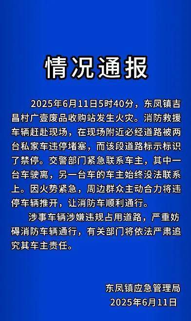另一则通报称,现场附近必经道路被两台私家车违停堵塞,而该段道路标示标识了禁停。交警部门紧急联系车主,其中一台车驶离,另一台车的车主始终没法联系上。因火势紧急,周边群众主动合力将违停车辆推开,让消防车顺利通行。涉事车辆涉嫌违规占用道路,严重妨碍消防车辆通行,有关部门将依法严肃追究车主责任。